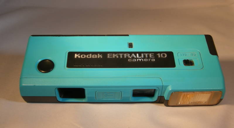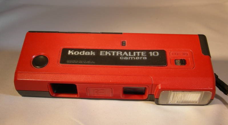 The Kodak Ektralite 10 camera was an inexpensive 110-format point and shoot camera produced by Eastman Kodak from 1978 to 1994. It has a built-in electronic flash and a sliding cover to protect both the lens and viewfinder from dust and scratches. These cameras were one of the first 110 cameras to feature automatic film speed detection, in which the camera would automatically adjust the shutter speed in relation to the speed of the film. Towards the end of the production run, they came in various colors such as Black, yellow,Pink, purple, orange, red and turquise, but without the sliding cover in front.