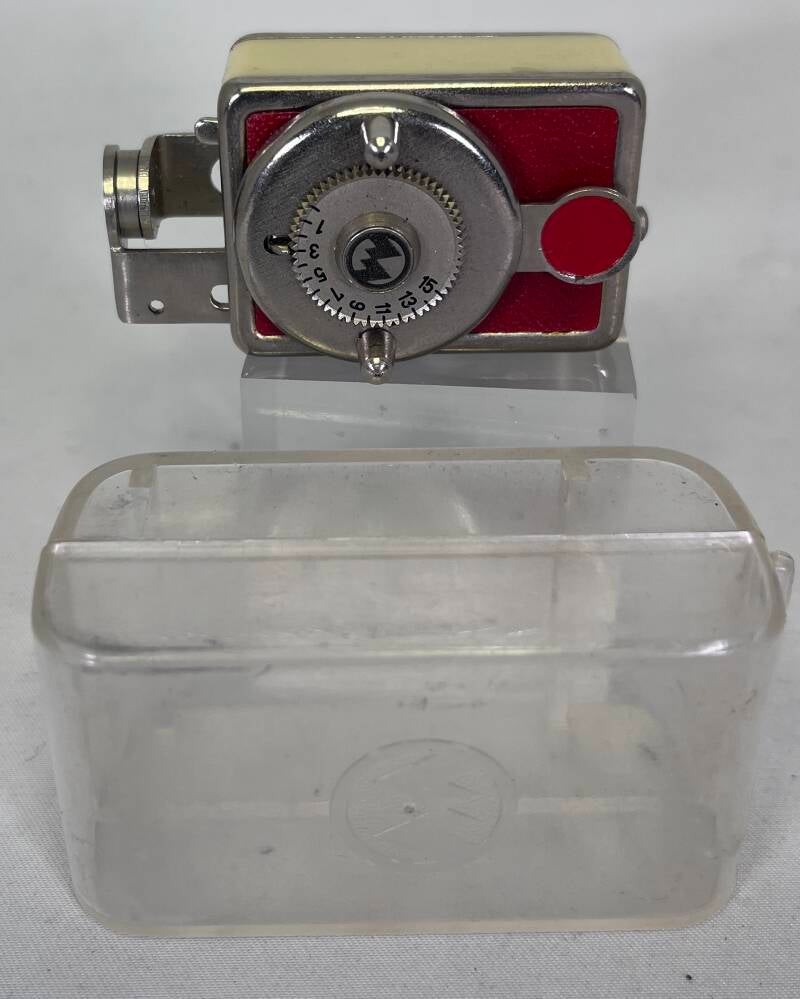 Haka Autoknips Mod.1 zelfontspanner, Fabrikant: Heinrich Klapprott Autoknipsfabrik. Plaats van creatie: Hamburg, Duitsland. Datum van creatie: jaren dertig. Camerasluiter zelfontspanner "Haka-Autoknips", mechanisch, veeraangedreven, met vertraging van de ontspanknop, wordt gebruikt voor aansluiting op een camera via een ontgrendelingskabel. Maximale gebruiksduur van de zelfontspanner – ongeveer 1 min. In een metalen, rechthoekige behuizing is een veermechanisme geplaatst. Op de voorwand bevindt zich een roterende strip die eindigt met een ronde rotatie-indicator. Op de strip zijn twee knoppen gemonteerd om de veer op te winden. De veerontgrendelingshendel bevindt zich op de linkerzijwand. In de bovenwand bevindt zich een intrekbare strip met een tandwiel, eindigend met een handvat voor het bevestigen van de trekkerslang. Na het bevestigen van de slang en het loslaten van de veer trekt de strip zich terug door op het uiteinde van de slang te drukken totdat de sluiter wordt losgelaten.