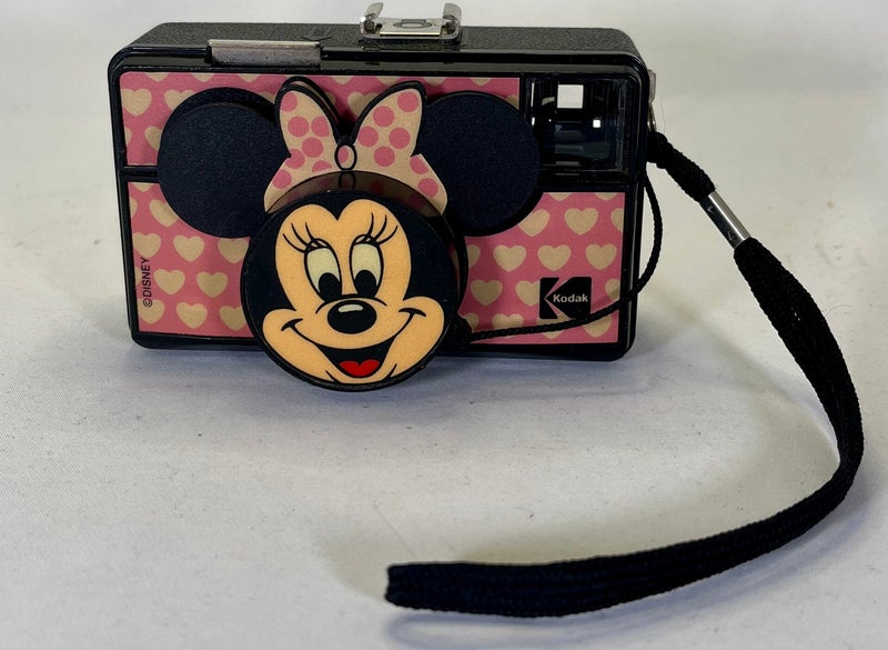 These cameras you probably have never seen. Very, Very rare. They were not even seen in the George Eastman Museum in Rochester, N.Y. they are from Brasil. They are the same as the Kodak Instamatics, made in Brazil by Kodak, with Kodar lenses. There is a flash shoe on top and the faces of Mickey, also lens caps with retention cord so you can't loose it. There is also a Minnie camera.