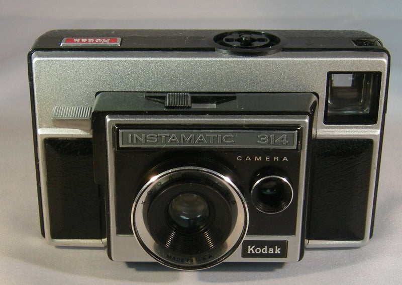 Kodak Instamatic 314, An automatic exposure camera with the facility for relatively close-up photography, there being a slider on the top of the lens housing to set either 2-6 feet or beyond 6 feet. Flash is provided by flashcubes.